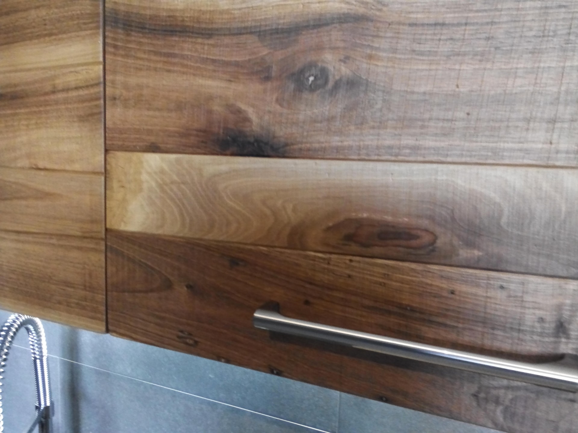 Cucina costruita in legno di noce su misura con effetto finta muratura e con lavello in marmo.