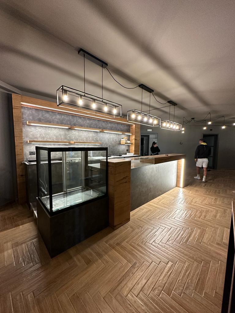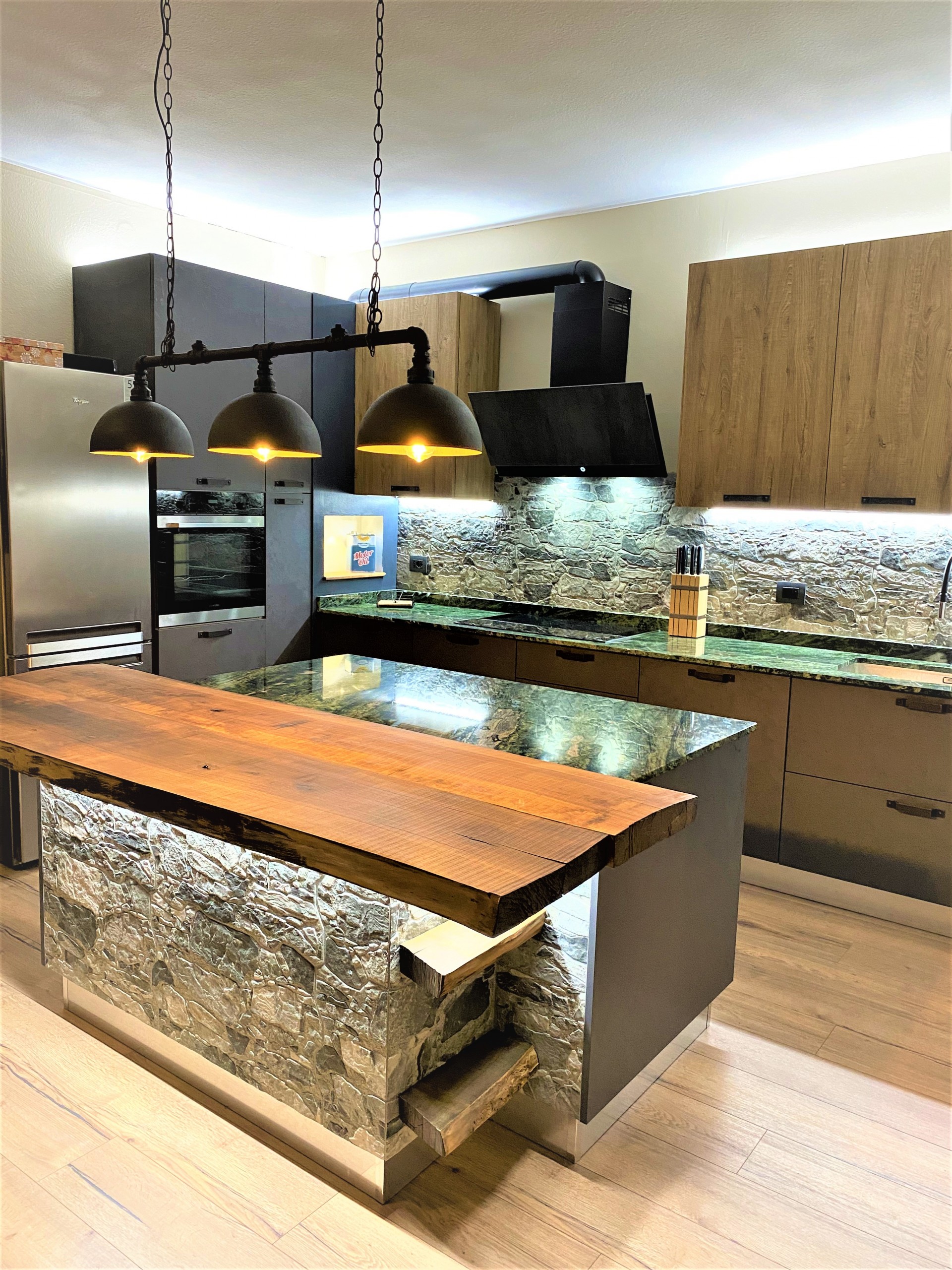 Cucina moderna costruita artigianalmente su misura con top in granito venato.