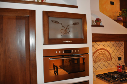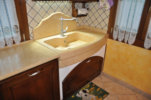 Cucina in muratura con lavello in marmo costruita in legno di noce su misura. La finta muratura permette di recuperare lo spazio all'interno ma da l'effetto di vero muro.
