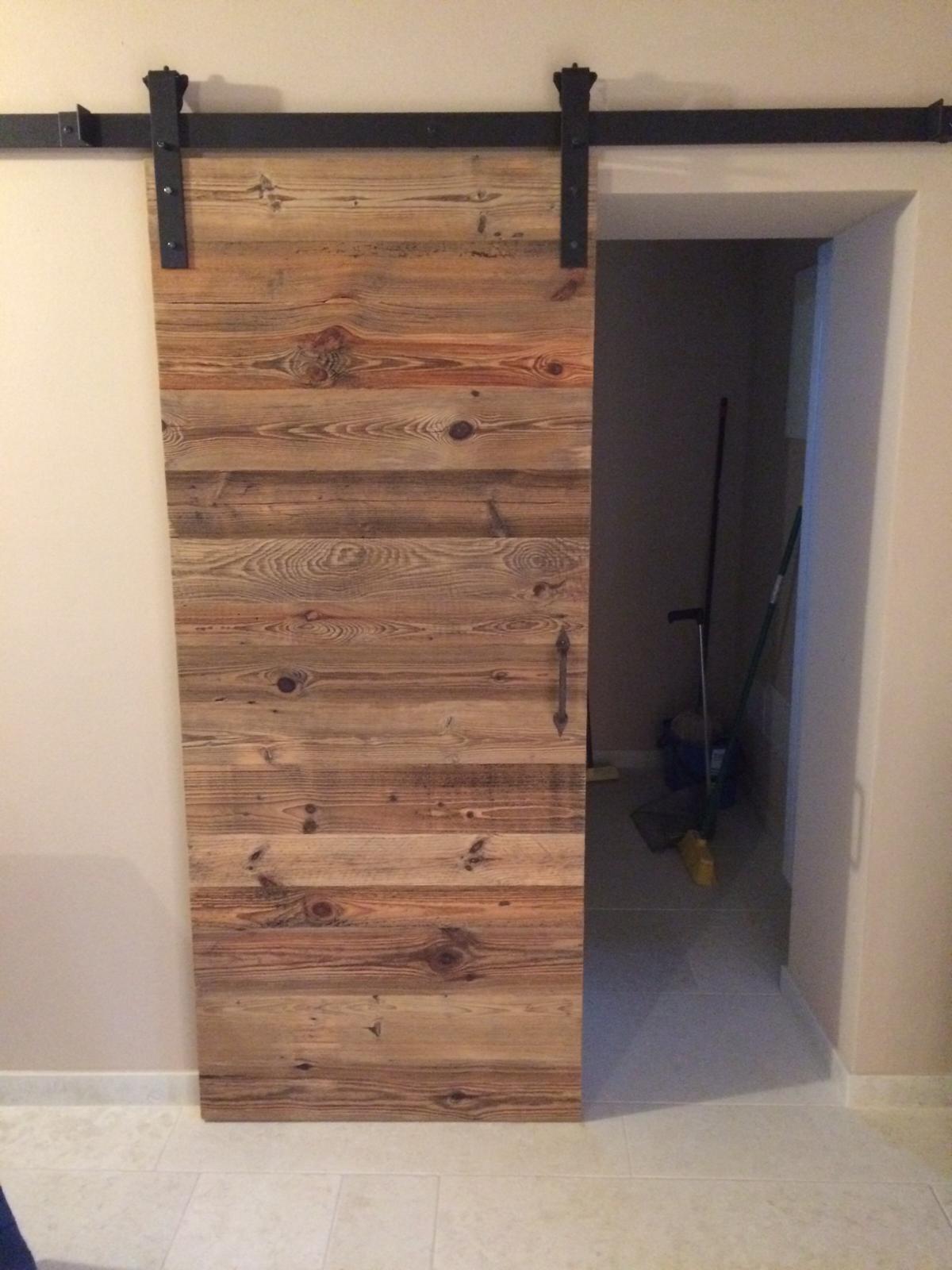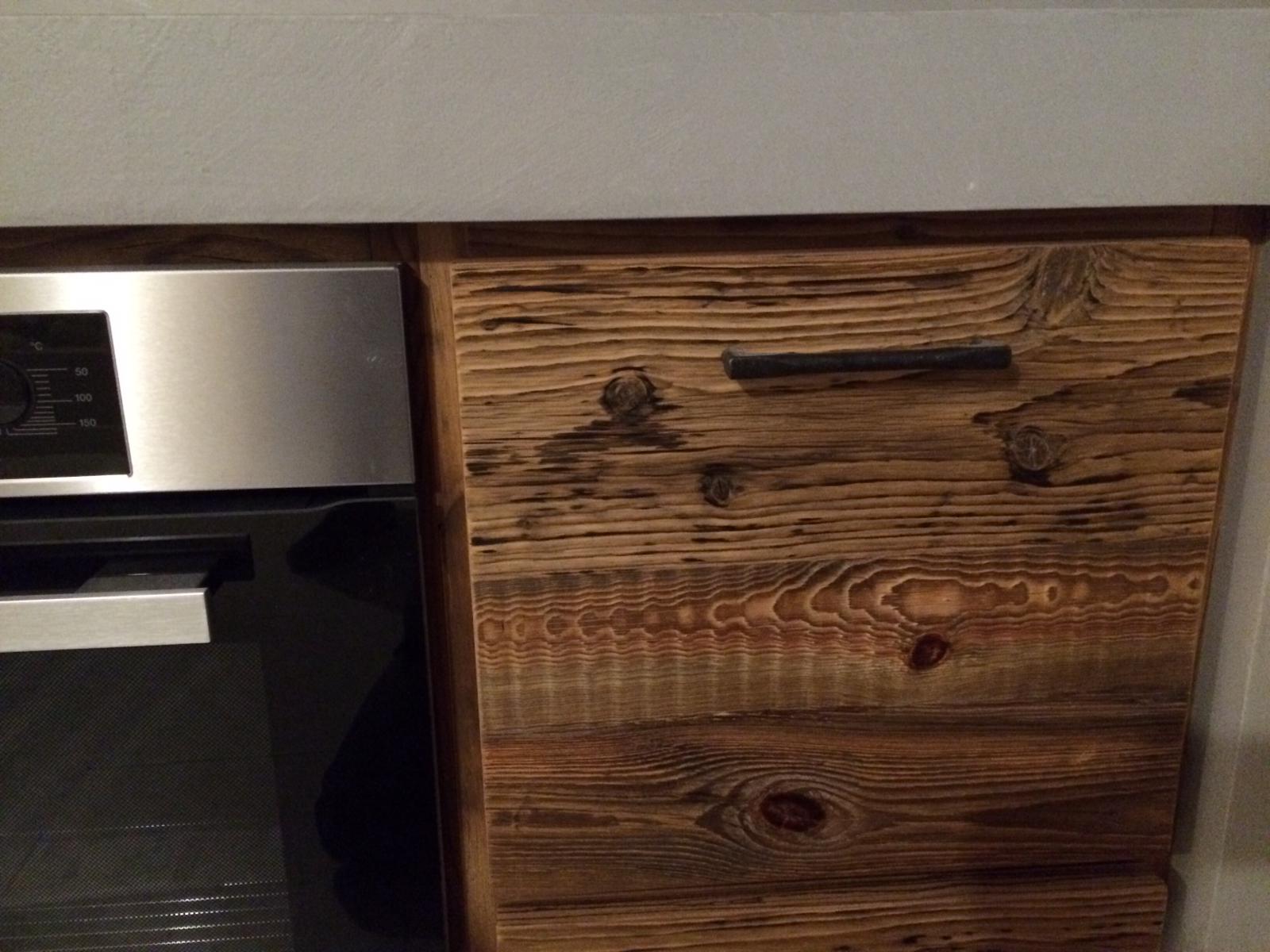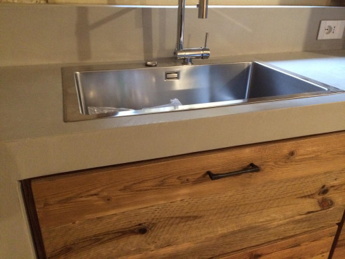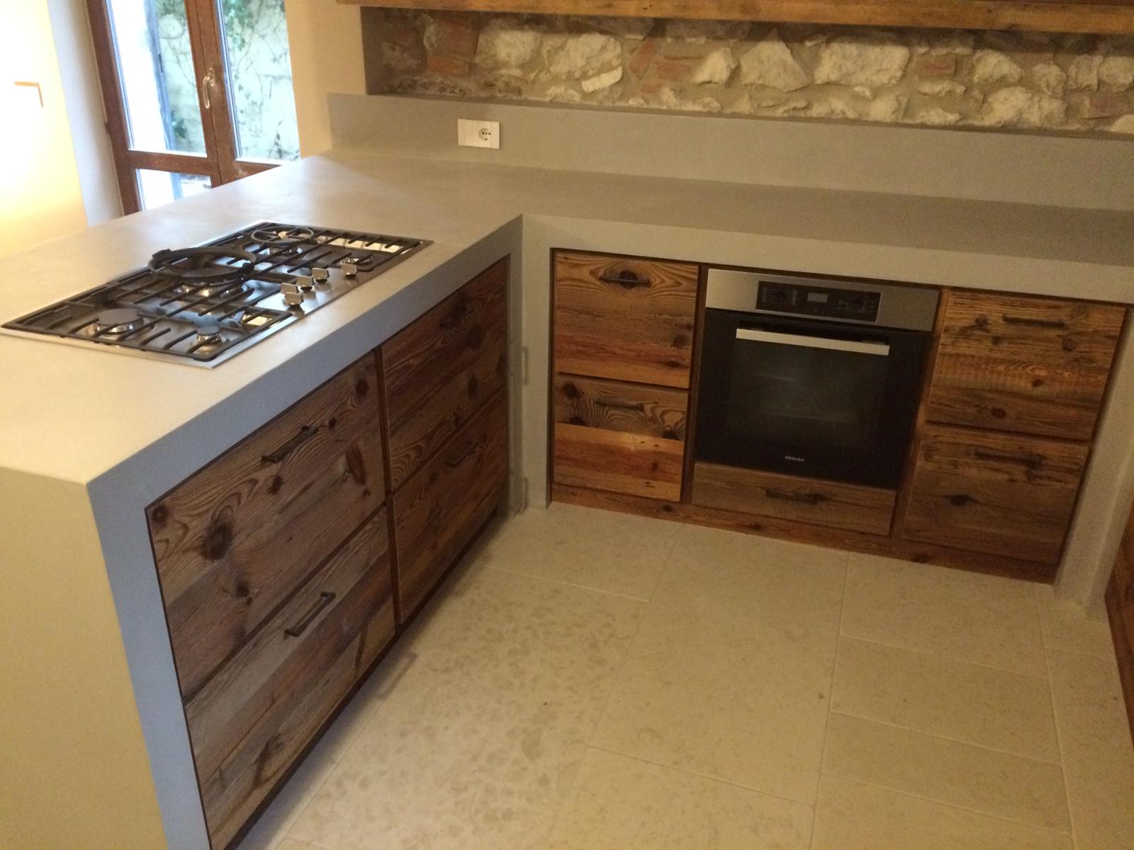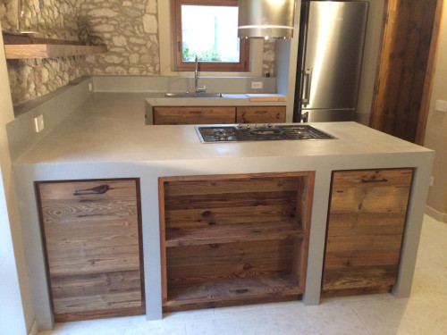 Cucina in muratura con isola progettata dall' Architetto Spinelli Arianna di Verona. La cucina ha i muretti ed il top rivestiti in resina effetto cemento. I mobili sono stati costruiti su misura utilizzando tavole di abete vecchio prima patina beige selezionato.