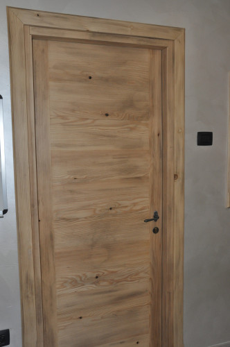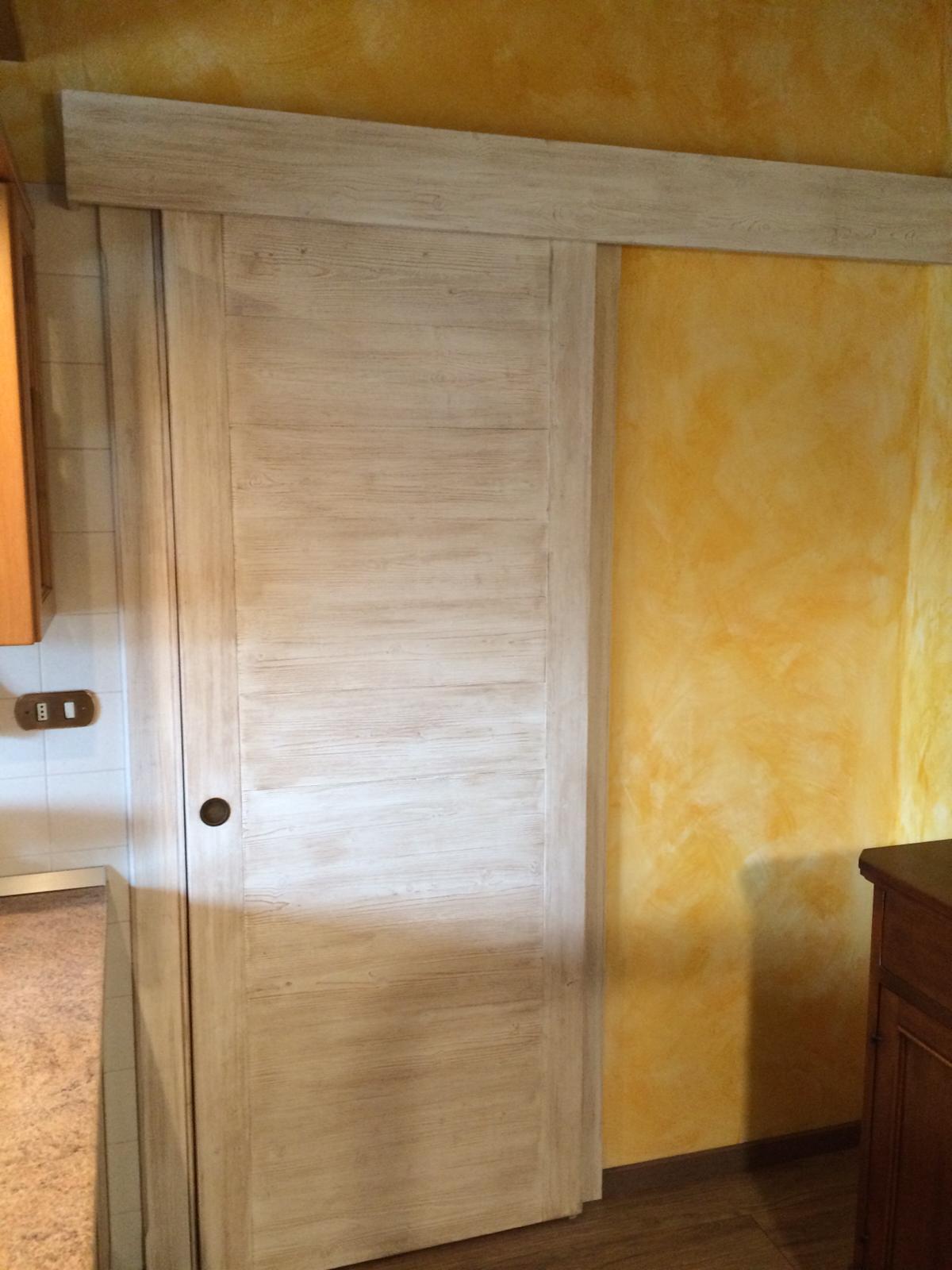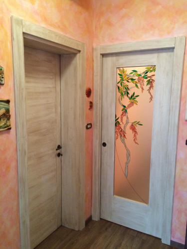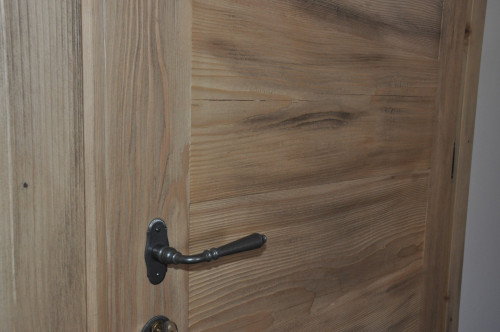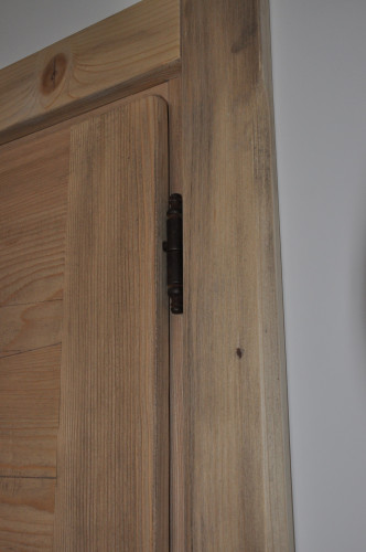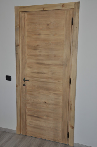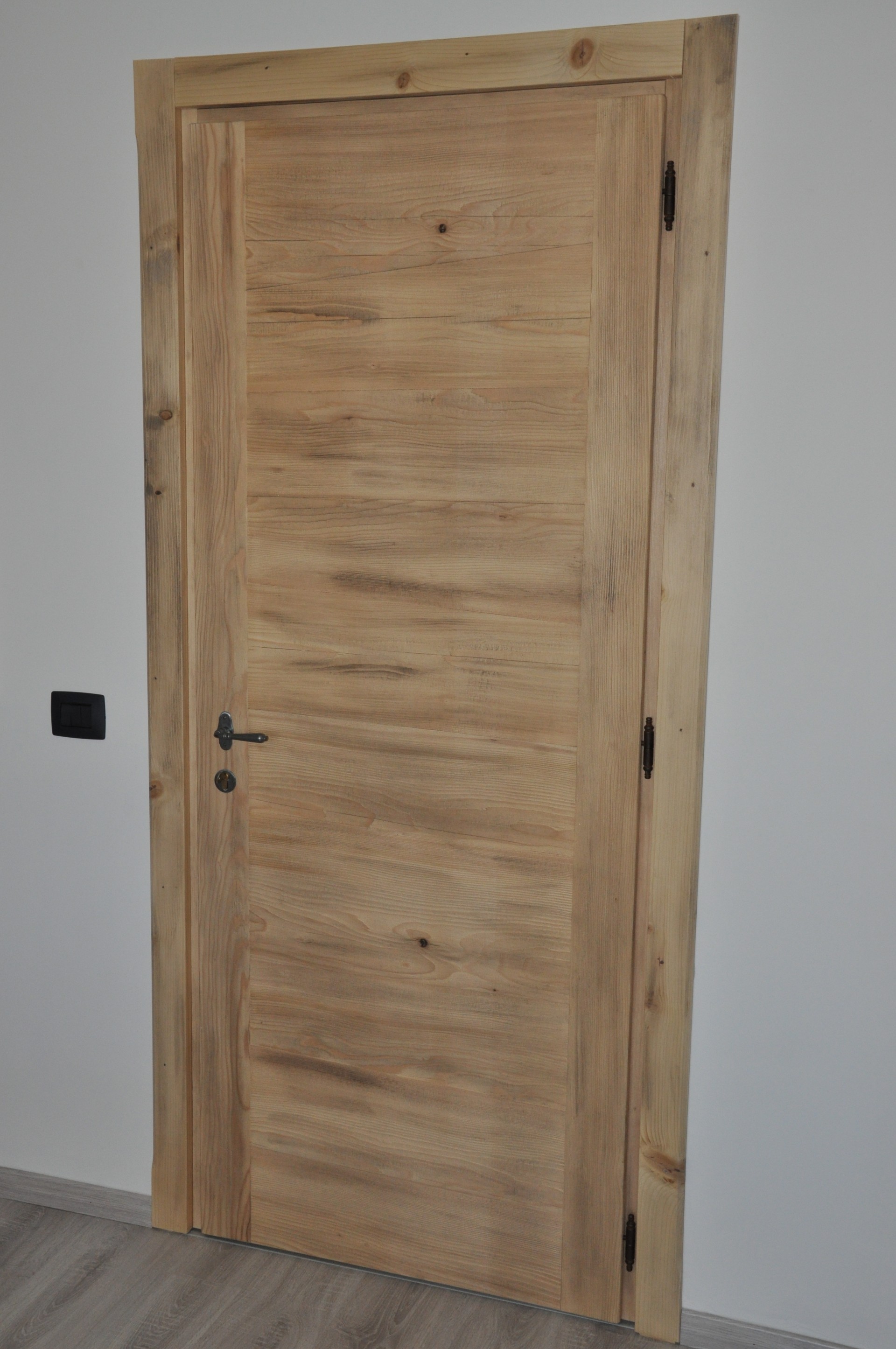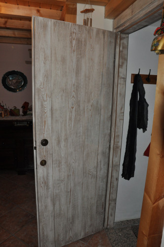 Porta per interno costruita su misura in legno di abete spazzolato e laccato a mano con anticatura. La porta è costruita con un'anima centrale in lamellare rivestita da ambo i lati da lamelle di abete di vari spessori.