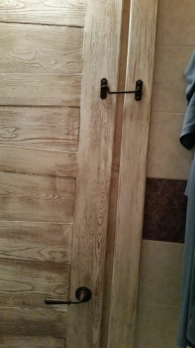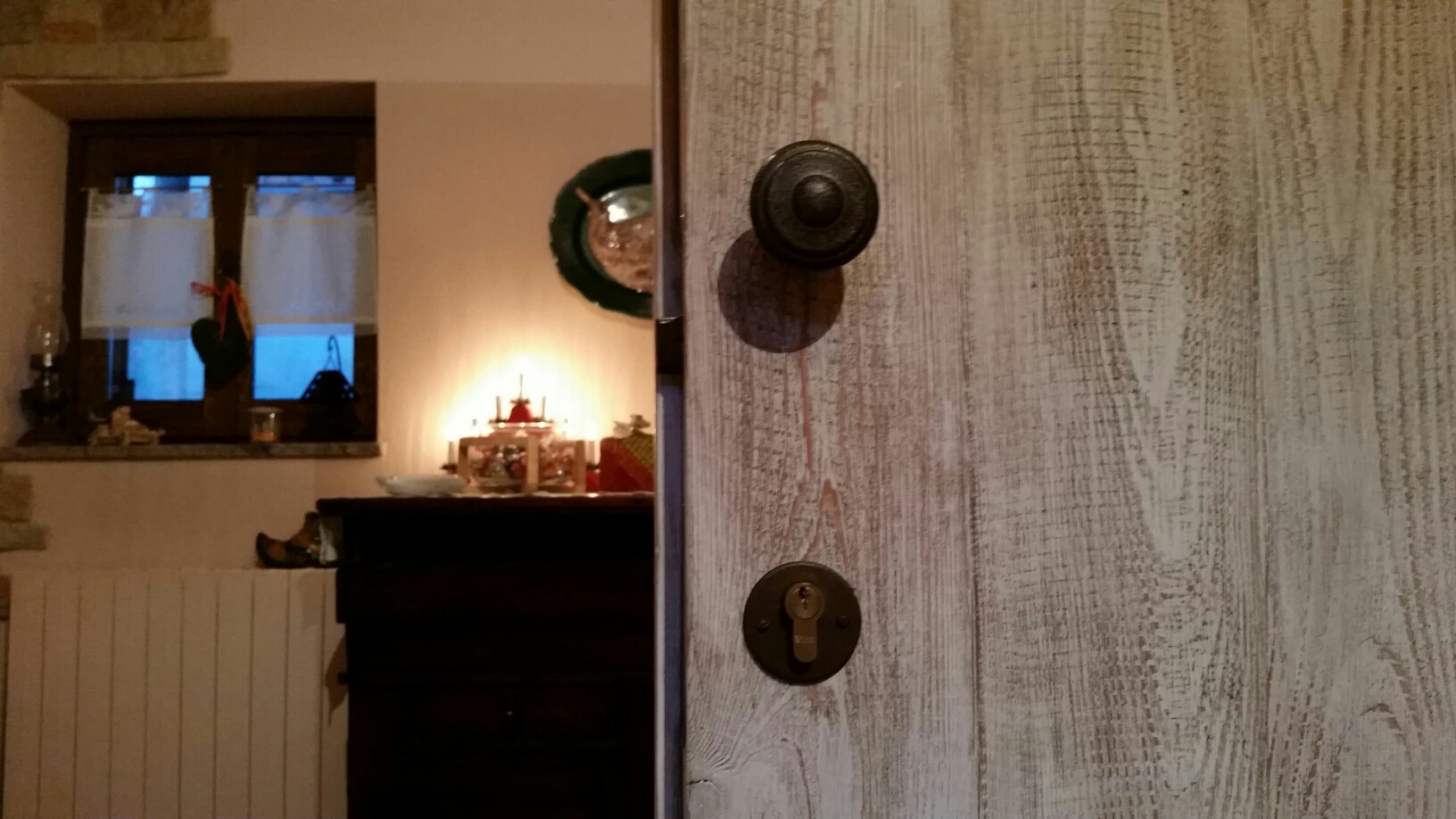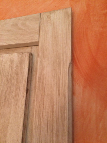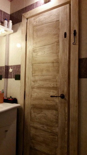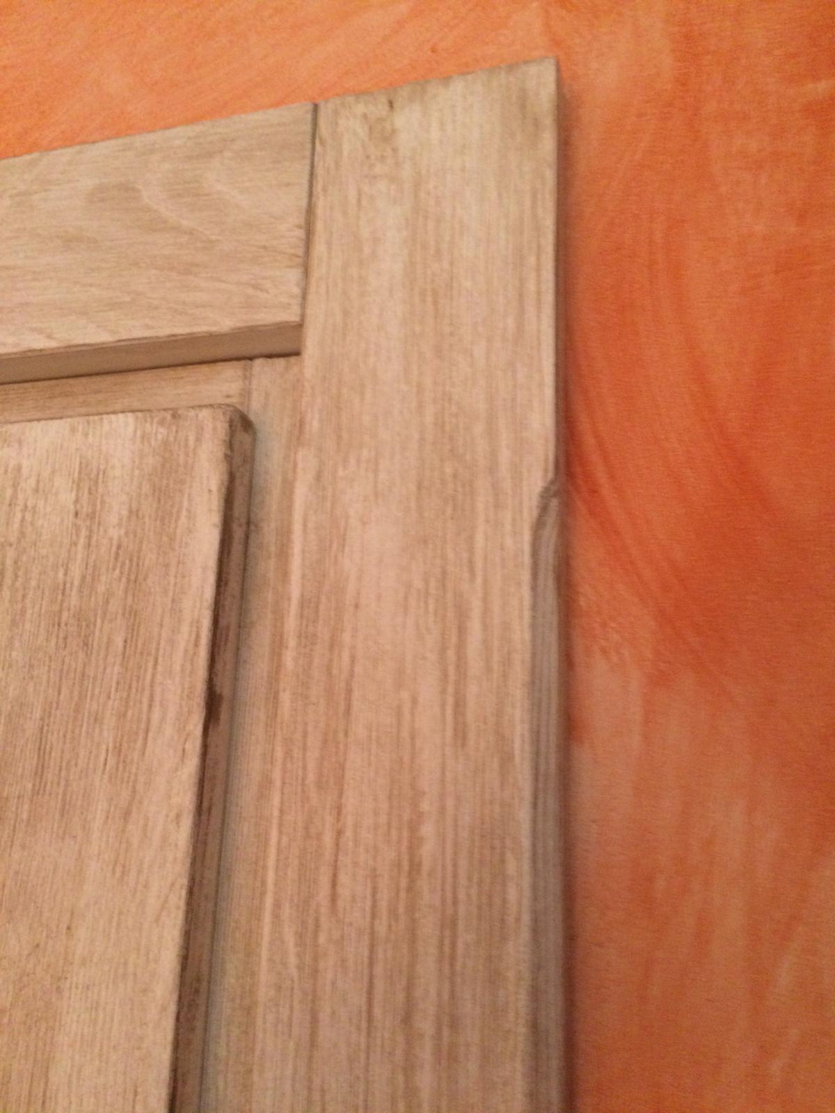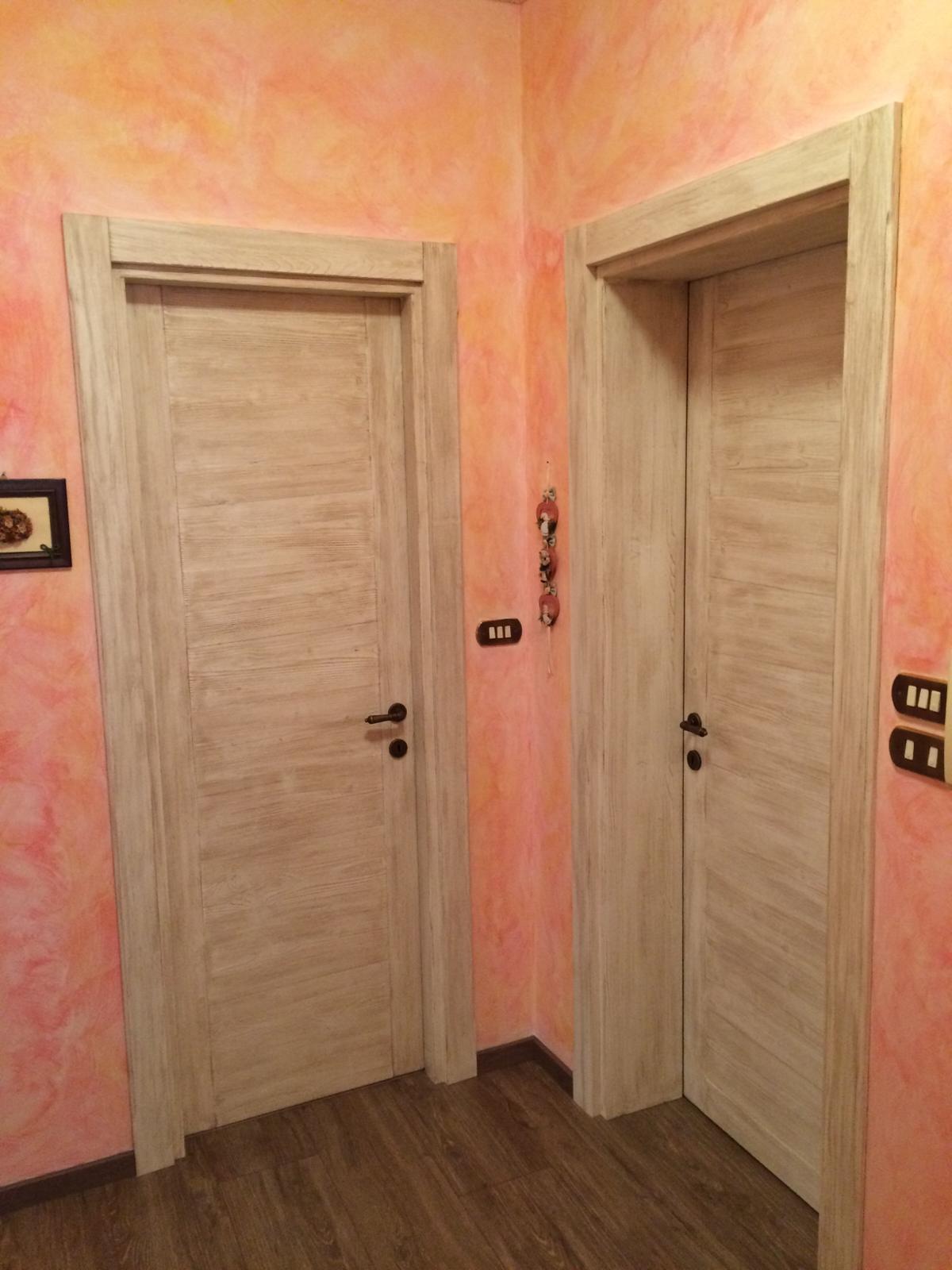 Porta per interno costruita su misura in legno di abete spazzolato e laccato a mano con anticatura. La porta è costruita con un'anima centrale in lamellare rivestita da ambo i lati da lamelle di abete di vari spessori.