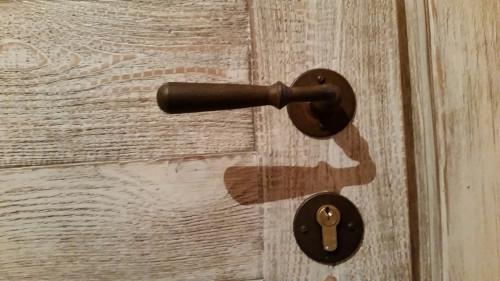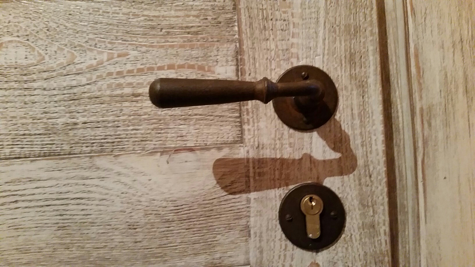 Grazie a questo sistema di costruzione artigianale le assi con giuntura non parallela, avendo spessori diversi, creano questo effetto 3D ed aumentano l'effetto rustico della porta.